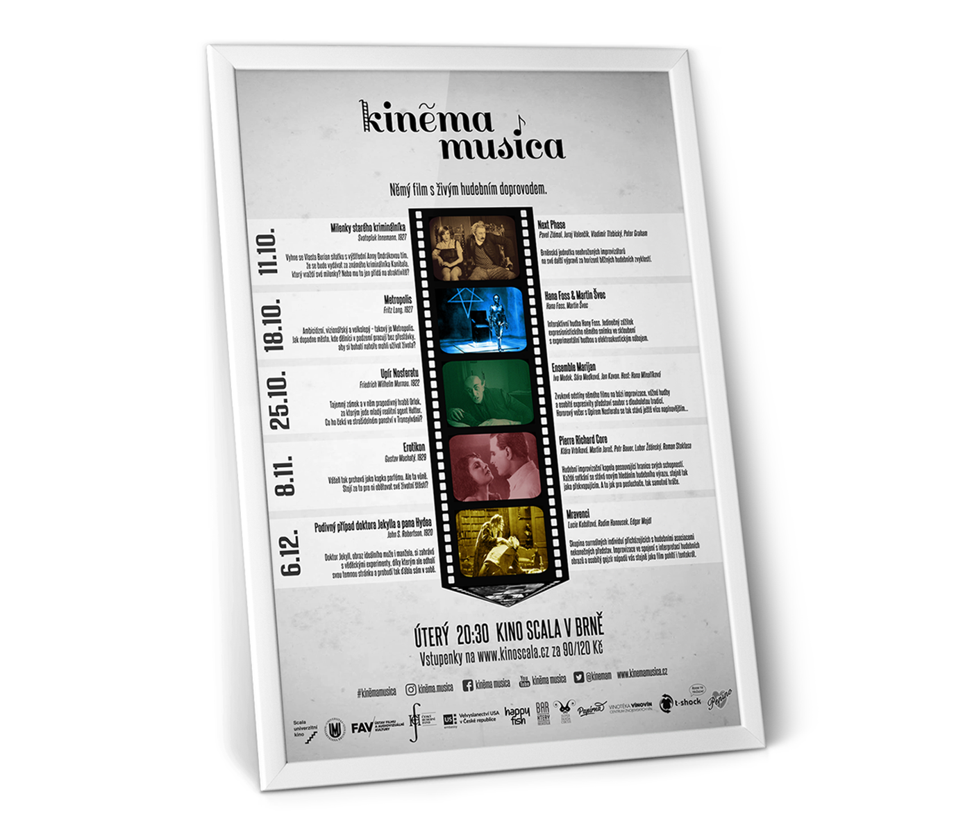 Logó, plakát, táska és kitűző dizájn a Masaryk Egyetem diákjai által szervezett Filmfesztiválja számára, amely 2016 október és decembere között zajlott, és a kinẽma musica nevet viselte. További információ a fesztivál hivatalos oldalán: kinemamusica.cz
