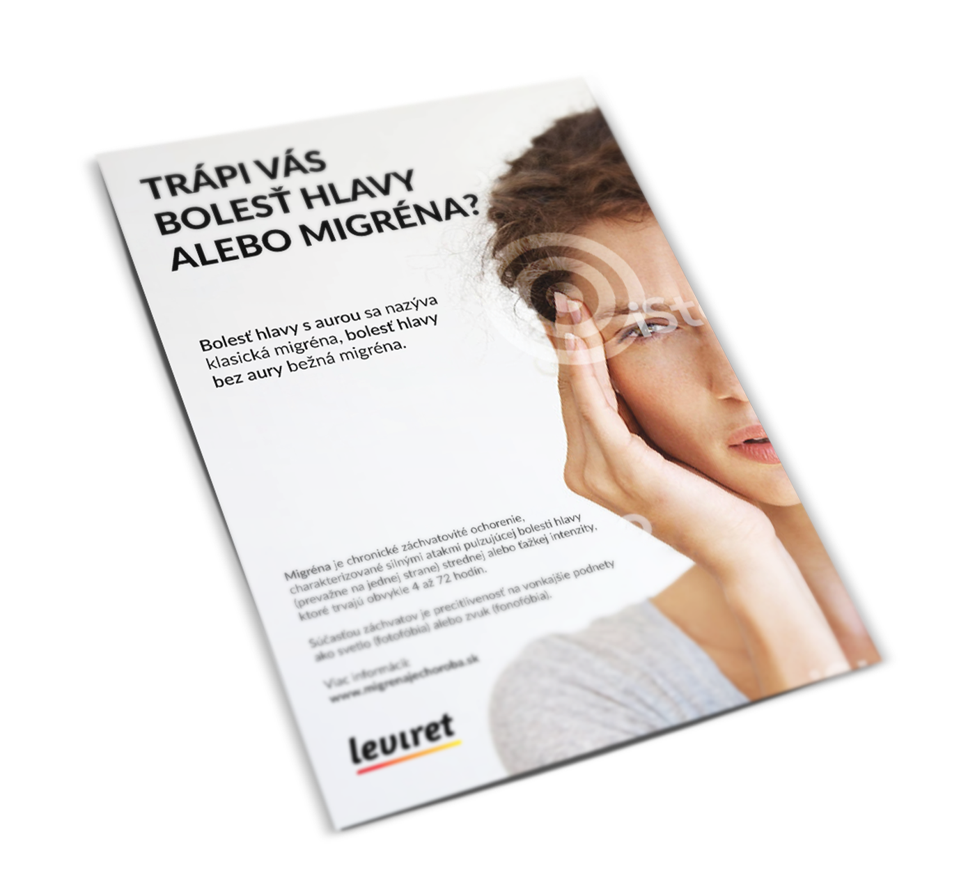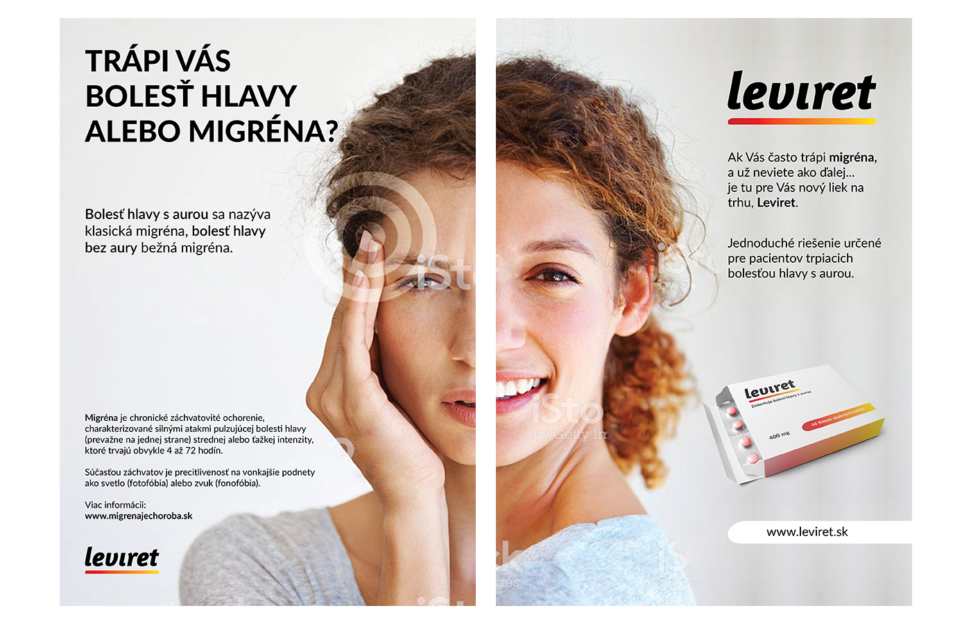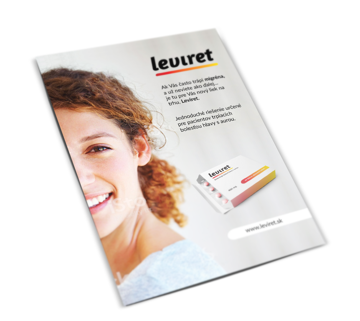 Leviret is the name of a fictional medication for headache. I made this design as part of a job interview for a creative agency in Bratislava, which mostly deals with healthcare and pharmaceutical products and innovations. I was told to design a logotype for a medication for headache with aura, and a two-sided A4 flyer with information on the disease and the medication.